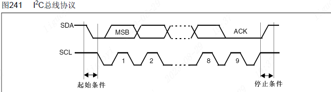 I2C只有两根通信线,因此它数据传输是基于时钟信号的。各个设备在时钟信号的控制下进行数据的收发操作。下面是I2C总线的几个重要的时序: