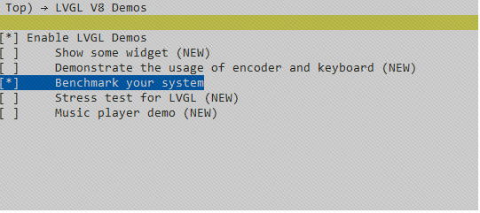 本示例用来演示LVGL V9的官方示例,使用官方提供的demo应用程序。 可以使用menuconfig来选择演示的demo应用程序。包含的应用程序有: