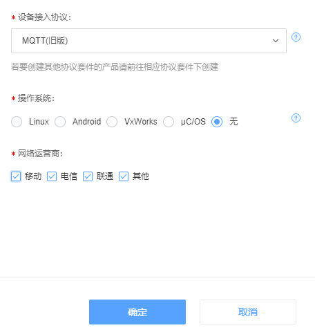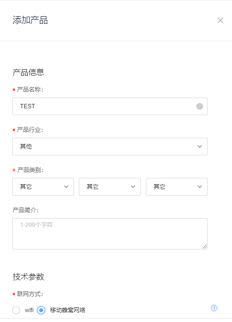 - 在弹出的“添加产品”界面,依次填入产品名称、产品行业、产品类别、产品简介(可选)、联网方式、设备接入协议、操作系统和网络运营商信息。本例中,产品名称填写 TEST、产品行业选择其他、产品类别选择其他、联网方式选择移动蜂窝网络、设备接入协议选择 MQTT(旧版)、操作系统选择无、网络运营商选择移动、电信、联通和其他,如下图所示。