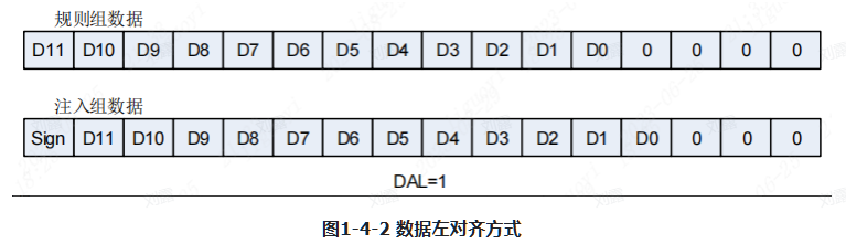 在左对齐模式下,ADC的数据被左对齐到最高位,不足的位数在低位填充0。左对齐模式可以提高分辨率,但会导致动态范围降低。